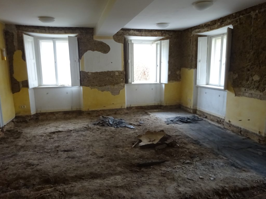 Inzwischdn ist der bröckelnde Putz entfernt, die verschlissene Heizung und alle Steckdosen sind demontiert, die schadhaften Fußböden und stark lädierte Holzbalken sind inzwischen herausgenommen. Das gesamte Erdgeschoss im Pfarrhaus Brandis ist aktuell eine Baustelle mit viel Staub und vollen Containern. Aktuell erfolgt die Trockenlegung und nach und nach werden Fußböden, Innenputz, Elektrik, Wasser und Heizung erneuert.